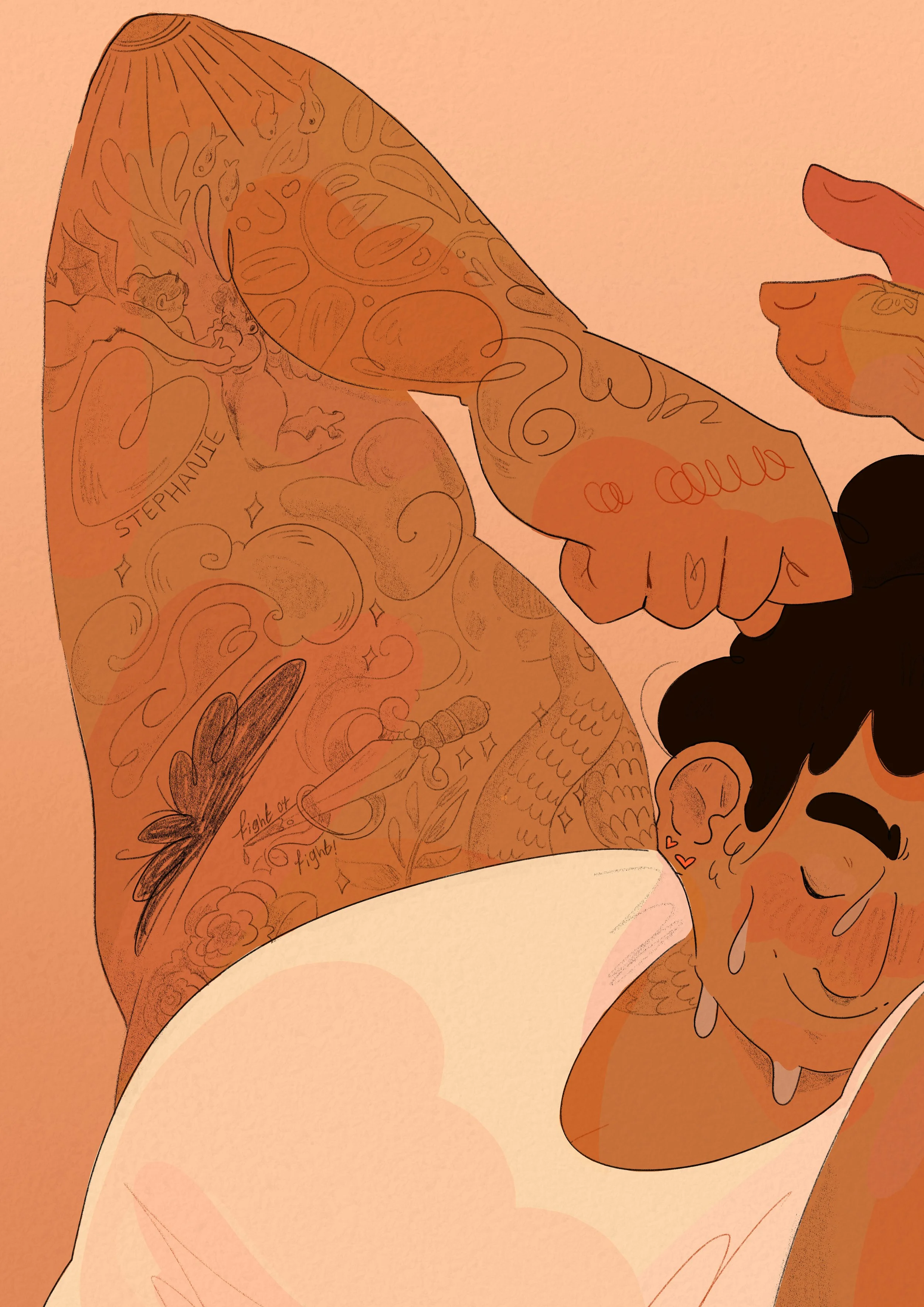 I also had some issues with the tattoos, this I because I was figuring out how to draw details tattoos with it, keeping within my style and not looking jarring or taking too much focus on the character. I solved this one by colouring the linework a very light colour to allow it to sit in the background/her arm.